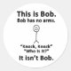 For the sarcasm lover in all of us. Check out this witty “This is Bob. Bob Has No Arms. Knock Knock. Who is it? It’s Not Bob.” design on apparel and gifts.