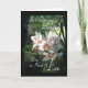 This adult baptism card shows a photograph of beautiful springtime orchids with a green wooded background. The words on the front of the card say, "As Christ was Raised Now in Him I Live." The inside left shows the Bible verse from 2 Corinthians 5:17 which says, "Therefore if any man be in Christ, he is a new creation: old things are passed away; behold, all things are become new." The inside right says, "Today your feet are being fitted into His path. You will no longer be wandering to the left or looking to the right. He is the voice behind you saying, 'This is the way. Walk in it.' "