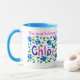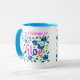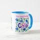 A white ringer mug with a powder blue rim and handle, decorated with a floral handpainted paper collage and the words 'This Mug Belongs to Chloe'. Dishwasher and microwave safe.