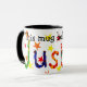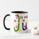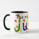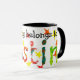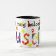 Add some flair to your mug design with the Ringer Mug. Handle and lip of the mug are coloured to match. 11 oz. or 15 oz. Available in 6 colours. Dishwasher and microwave safe. The colourful design is a handpainted paper collage. See also matching greeting cards and gifts.