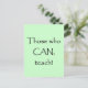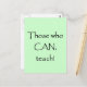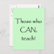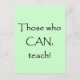 Black text teacher T-shirts, mugs, cards, stickers, postage, tote bags, magnets, and more reads "Those who CAN teach!"