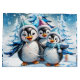 Three adorable penguins stand in festive winter hats and colourful scarves. Their big, round eyes shine with joy, while their fluffy white bellies contrast with the bright blue Christmas tree decorated with twinkling lights. The penguins smile happily and seem ready to celebrate the magic of the holiday season. All around them, delicate snowflakes dance through the air, while twinkling stars shine in the sky, creating a warm, festive atmosphere. This design perfectly captures the spirit of Christmas - full of joy, friendship and winter wonder!
