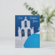 Postcard of Santorini, Greece showing the three bells of Fira. This photographic image captures the blueness of the sea behind. Santorini is one of the most popular Greek islands and having visited it is not hard to see why. There are two idyllic towns the capital Fira and the town of Oia where people gather to see the spectacular sunset everyday. They both have lots of white washed buildings and narrow streets as well as blue dome churches. Santorini is a very popular Greek island for couples that want to get married in the sun. If however you want a beach then you would have to come away from Fira and Oia, as pretty as they are, they do not have beaches. Santorini, Greece postcard