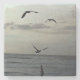 This is an image of my son with three birds at the ocean from a photo I took on a stone coaster.