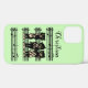 This iPhone case is light green with three black cat musicians playing their instruments while standing on black sheet music. Customise your name with the template.