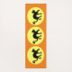 This yoga mat is bright orange with three full yellow moons each have a black cat with green eyes and arched backs. The back of the mat is black.