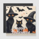 Three black cats with glowing orange eyes sit among pumpkins. Two wear witch hats as bats fly across the sky. A playful yet mystical Halloween scene that blends charm, magic, and a touch of gothic allure.