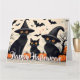 Three black cats with glowing orange eyes sit among pumpkins. Two wear witch hats as bats fly across the sky. A playful yet mystical Halloween scene that blends charm, magic, and a touch of gothic allure.