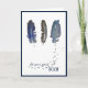 A trio of watercolor feathers in hues of blue, grey and black. A splattering of silhouetted birds in flight frames the outside message, "let your spirit soar". Inside is blank.