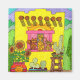 These three curious cats are sitting in the pink-framed window of a bright yellow Taos-style adobe dwelling in the American southwest. Richly textured cacti and sunflowers in colourful talavera pots, as well as a sun painted over the window, accent the house, providing a welcome contrast to the desert sand. Purple mountains and greenery brighten the background beneath a cloudless bright blue sky.