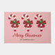 Destei's original illustration of three red and white striped Christmas candy cane treats decorated with a red bow and a Christmas holly / Common holly plant. The background colour is pink. There are also two personalizable text areas.