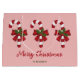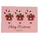 Destei's original illustration of three red and white striped Christmas candy cane treats decorated with a red bow and a Christmas holly / Common holly plant. The background colour is pink. There are also two personalizable text areas.