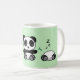 Three adorable little pandas sitting beside each other. One happy panda is wearing a tee shirt with "I heart panda" written on it. Another is offering a green bamboo stick to a third panda that has fallen asleep.