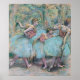 Three Dancers. Edgar Degas. Pastel on paper on cardboard. Cute portrait in pastel blue and pink tones. Three ballerinas in blue skirts stand and look from behind the scenes at the stage Reproduction of famous works of art images in the public domain.
