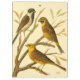 Artist W. Rutledge captured perfectly the vivid colours of those domestic birds. Get this simple yet beautifully realistic painting. Side view of two yellow birds and one darker bird on a branch and looking in different directions.