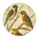 Artist W. Rutledge captured perfectly the vivid colours of those domestic birds. Get this simple yet beautifully realistic painting. Side view of two yellow birds and one darker bird on a branch and looking in different directions.