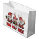 Cute "HO HO HO!" large Christmas gift bag featuring three charming holiday gnomes in red patterned hats—one with a wreath, one with a present, and one with a sparkler. Perfect for wrapping gifts for kids, friends, and family. Ideal for holiday parties and gnome lovers. Durable white paper bag with handles.