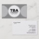 A business card template with a three gear or cog wheels design. The centre gear has space for initials or Monogram, Company name and business type. Name and other contact details on the reverse side arranged on a plain background. This design can also be further customised. In this version the left and right cogs are semi-transparent so appear as a lighter version of the background colour, which can be customised.