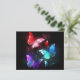 Three luminous, red, purple, green, textured, night butterflies on black luminous background.