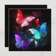 Three luminous, red, purple, green, textured, night butterflies on black luminous background.