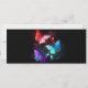 Three luminous, red, purple, green, textured, night butterflies on black luminous background.