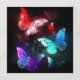 Three luminous, red, purple, green, textured, night butterflies on black luminous background.