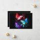 Three luminous, red, purple, green, textured, night butterflies on black luminous background.