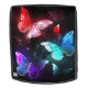 Three luminous, red, purple, green, textured, night butterflies on black luminous background.