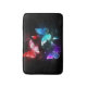 Three luminous, red, purple, green, textured, night butterflies on black luminous background.