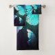 Three luminous, red, purple, green, textured, night butterflies on black luminous background.