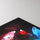 Three luminous, red, purple, green, textured, night butterflies on black luminous background.
