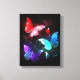 Three luminous, red, purple, green, textured, night butterflies on black luminous background.