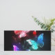 Three luminous, red, purple, green, textured, night butterflies on black luminous background.