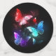 Three luminous, red, purple, green, textured, night butterflies on black luminous background.
