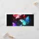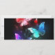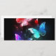 Three luminous, red, purple, green, textured, night butterflies on black luminous background.