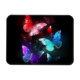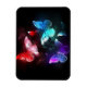 Three luminous, red, purple, green, textured, night butterflies on black luminous background.