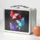 Three luminous, red, purple, green, textured, night butterflies on black luminous background.