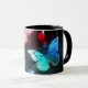 Three luminous, red, purple, green, textured, night butterflies on black luminous background.