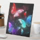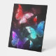Three luminous, red, purple, green, textured, night butterflies on black luminous background.