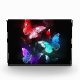 Three luminous, red, purple, green, textured, night butterflies on black luminous background.