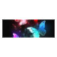 Three luminous, red, purple, green, textured, night butterflies on black luminous background.