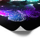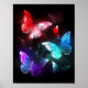 Three luminous, red, purple, green, textured, night butterflies on black luminous background.