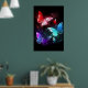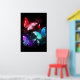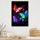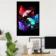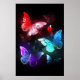 Three luminous, red, purple, green, textured, night butterflies on black luminous background.