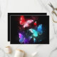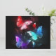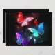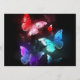 Three luminous, red, purple, green, textured, night butterflies on black luminous background.