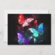 Three luminous, red, purple, green, textured, night butterflies on black luminous background.