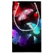 Three luminous, red, purple, green, textured, night butterflies on black luminous background.
