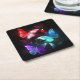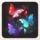 Three luminous, red, purple, green, textured, night butterflies on black luminous background.