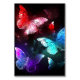Three luminous, red, purple, green, textured, night butterflies on black luminous background.