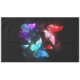 Three luminous, red, purple, green, textured, night butterflies on black luminous background.