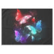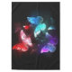 Three luminous, red, purple, green, textured, night butterflies on black luminous background.